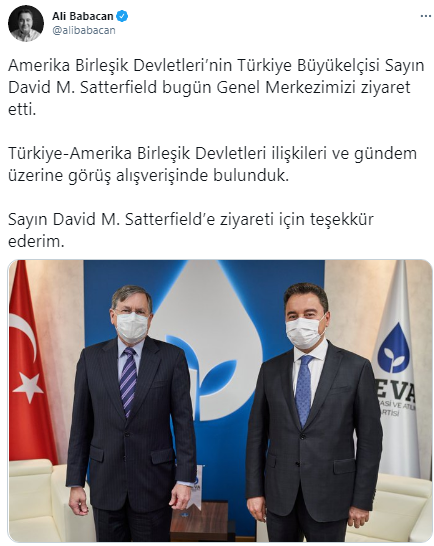 Ziyareti DEVA Partisi Genel Başkanı Ali Babacan sosyal medya hesabından yaptığı paylaşımla duyurdu. Yapılan paylaşımda "Amerika Birleşik Devletleri’nin Türkiye Büyükelçisi Sayın David M. Satterfield bugün Genel Merkezimizi ziyaret etti. Türkiye-Amerika Birleşik Devletleri ilişkileri ve gündem üzerine görüş alışverişinde bulunduk. Sayın David M. Satterfield’e ziyareti için teşekkür ederim." ifadeleri kullanıldı.
